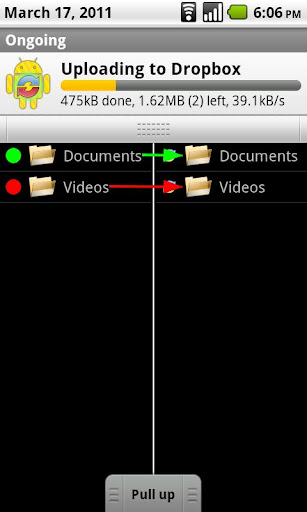 This unique app allows you to sync a set of folders from your Android device to the cloud and back. It currently supports the Dropbox storage service, as well as your own FTP, SFTP, FTPS servers. The official Dropbox app is *not* needed.